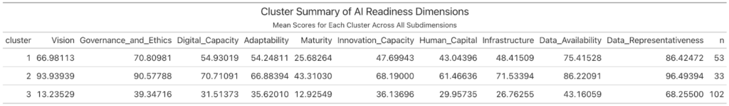 This chart shows three clusters of countries based on their pillar averages and total AI readiness scores. The grouping reveals clear tiers—low, medium, and high performers, indicating that countries share distinct structural patterns in AI readiness.