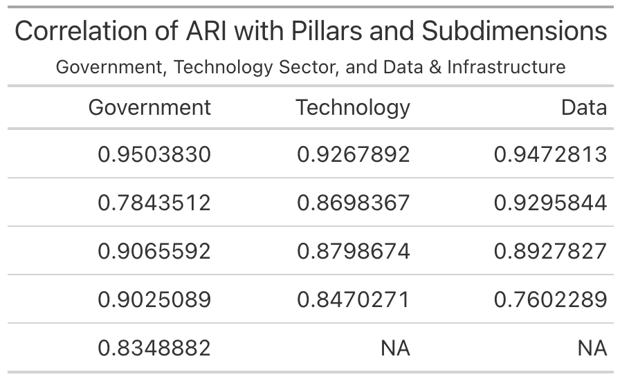 We also examined the correlation between each dimension and the AI readiness score. Each pillar shows a very high correlation with the overall AI Readiness Index (ARI), which is expected given that the pillars directly contribute to the total score. More informative are the subdimensions that correlate less strongly with the ARI. In particular, Vision, Data Representativeness, and Adaptability exhibit the weakest correlations, suggesting that performance in these areas varies more independently from a country’s overall readiness. In contrast, Infrastructure, Governance and Ethics, and Digital Capacity show the strongest associations with the ARI, indicating that these components are central drivers of overall AI readiness across countries.