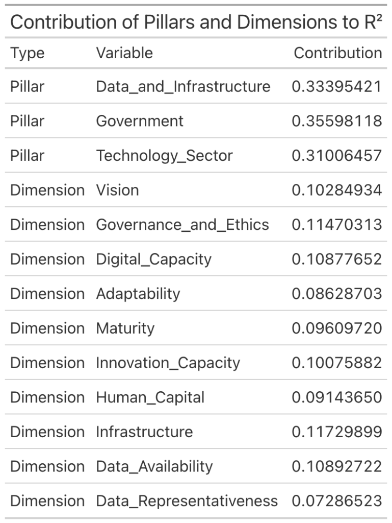 Using the relaimpo package in R, we were able to extract the relative importance of each pillar and dimension. Our results showed relatively even spread across the dimensions (represented in the first three rows) and pillars (represented in the last ten rows). Government contributed slightly more to the cross-country ARI variance, but overall, the three pillars contribute similarly. The relative importance of each dimension was also quite balanced, with Infrastructure and Governance and Ethics contributing the most, and Data Representativeness and Adaptability contributing the least.